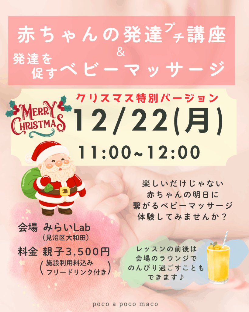2025/12/22(月)【対面】赤ちゃんの発達プチ講座&発達を促すベビーマッサージ教室★クリスマス特別バージョン★