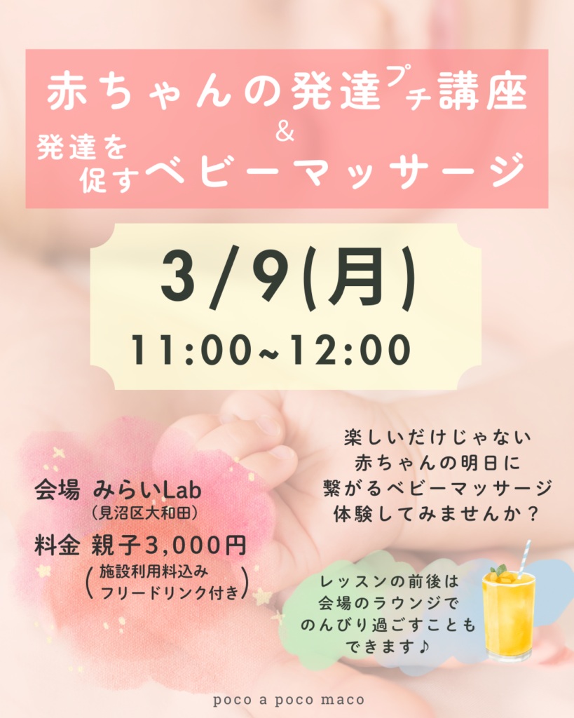 2026/3/09(月)【対面】赤ちゃんの発達プチ講座&発達を促すベビーマッサージ