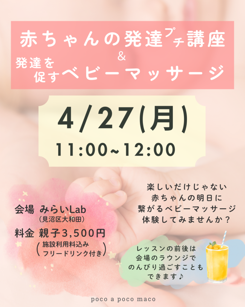 2026/4/27(月)【対面】赤ちゃんの発達プチ講座&発達を促すベビーマッサージ