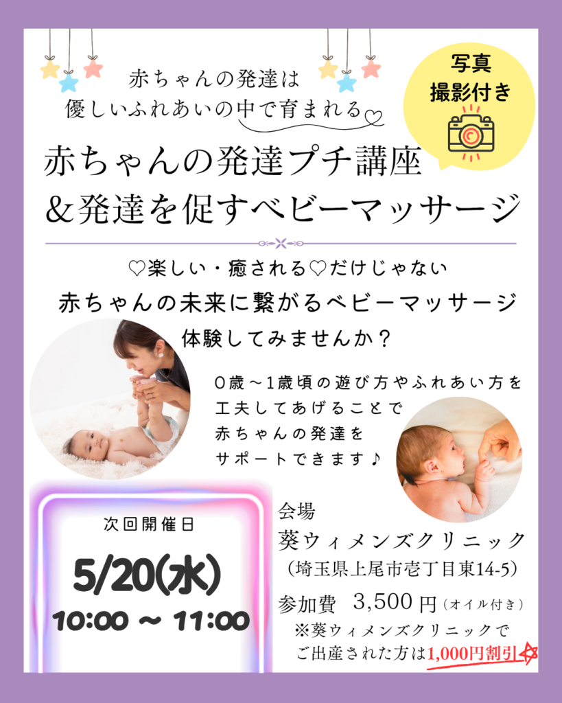 2026/5/20(水)【対面】葵ウィメンズクリニック 赤ちゃんの発達プチ講座&発達を促すベビーマッサージ