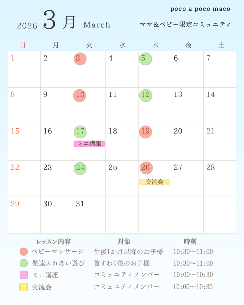 無理なく続けられるよう、すべての回が「自由参加」です。赤ちゃんの機嫌やママの体調に合わせて、気軽にご参加ください。