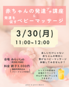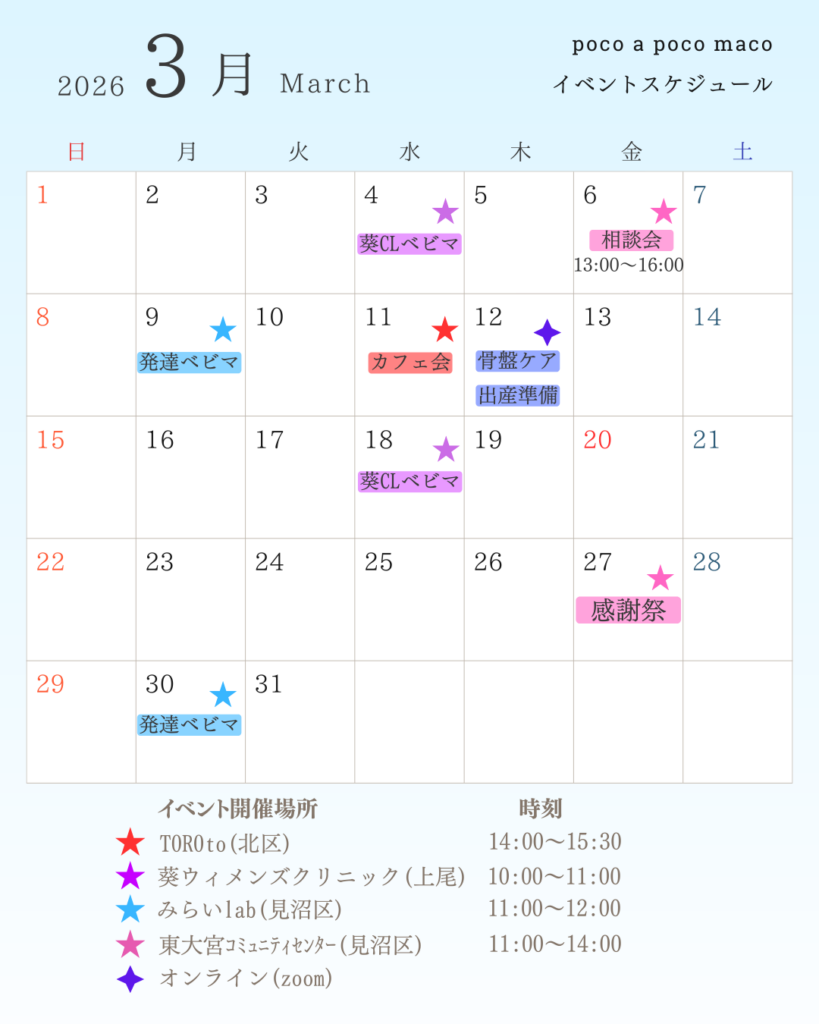 - 2026/3/04(水)【対面】葵ウィメンズクリニック 赤ちゃんの発達プチ講座&発達を促すベビーマッサージpoco a poco maco 大人気企画✨『赤ちゃんの発達プチ講座&発達を促すベビーマッサージ』を上尾市… 続きを読む: 2026/3/04(水)【対面】葵ウィメンズクリニック 赤ちゃんの発達プチ講座&発達を促すベビーマッサージ