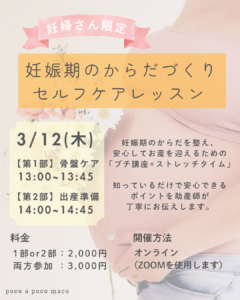 - 2026/3/12(木)【オンライン】※妊婦さん限定※妊娠期のからだづくり セルフケアレッスン(第1部:骨盤ケア/第2部:出産準備)妊婦さん限定イベント🤰❣️オンラインで開催する【助産師のプチ講座&セルフケアレッスン】のご案内です♪ 助産師… 続きを読む: 2026/3/12(木)【オンライン】※妊婦さん限定※妊娠期のからだづくり セルフケアレッスン(第1部:骨盤ケア/第2部:出産準備)