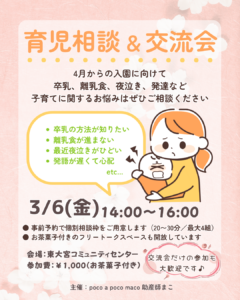 - 2026/3/06(金)【対面】育児相談会 & 交流会4月からの入園が決まり、ひとまず安心したママも多いと思いますが新生活に向けて、卒乳や離乳食、寝かしつけ、こど… 続きを読む: 2026/3/06(金)【対面】育児相談会 & 交流会