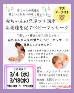 - 2026/3/04(水)【対面】葵ウィメンズクリニック 赤ちゃんの発達プチ講座&発達を促すベビーマッサージpoco a poco maco 大人気企画✨『赤ちゃんの発達プチ講座&発達を促すベビーマッサージ』を上尾市… 続きを読む: 2026/3/04(水)【対面】葵ウィメンズクリニック 赤ちゃんの発達プチ講座&発達を促すベビーマッサージ