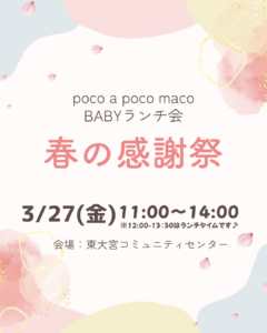 - 2026/3/27(金)【対面】春の感謝祭×poco a poco maco BABYランチ会和室でのんびり、ママも赤ちゃんもくつろぎながら季節のイベントを楽しむ大人気企画👏✨\\ poco a poc… 続きを読む: 2026/3/27(金)【対面】春の感謝祭×poco a poco maco BABYランチ会